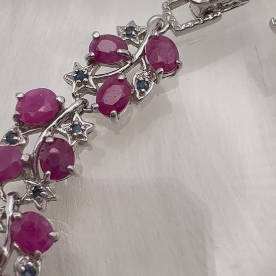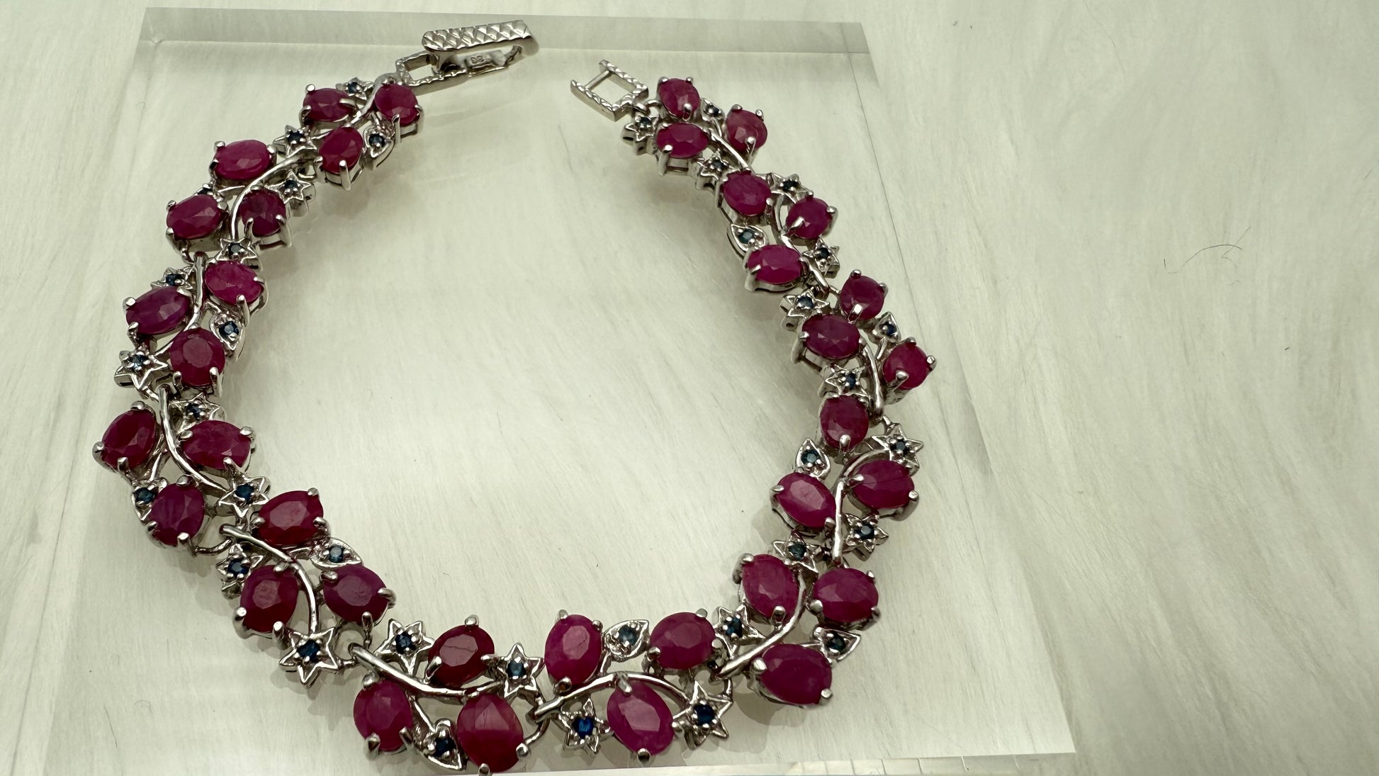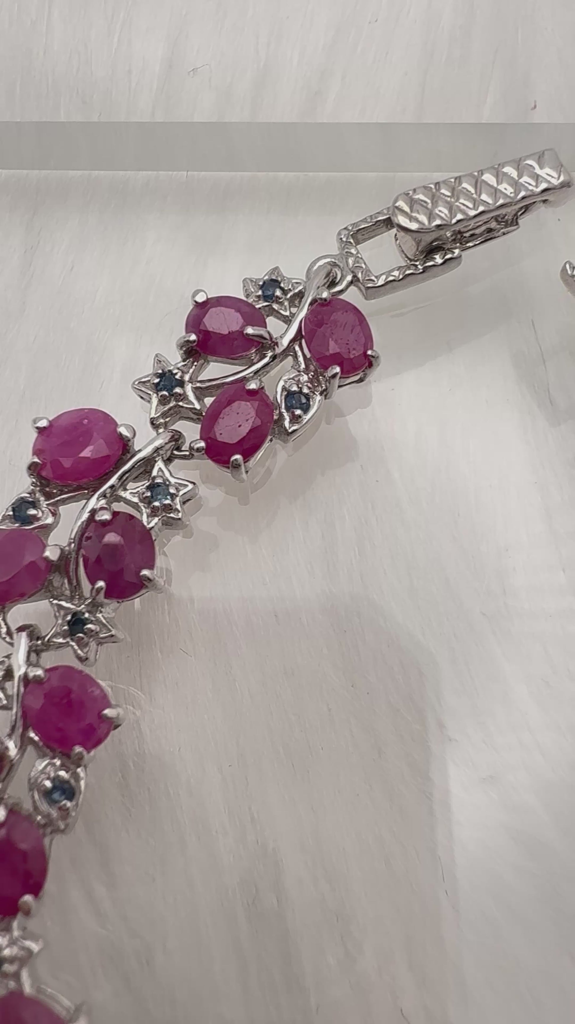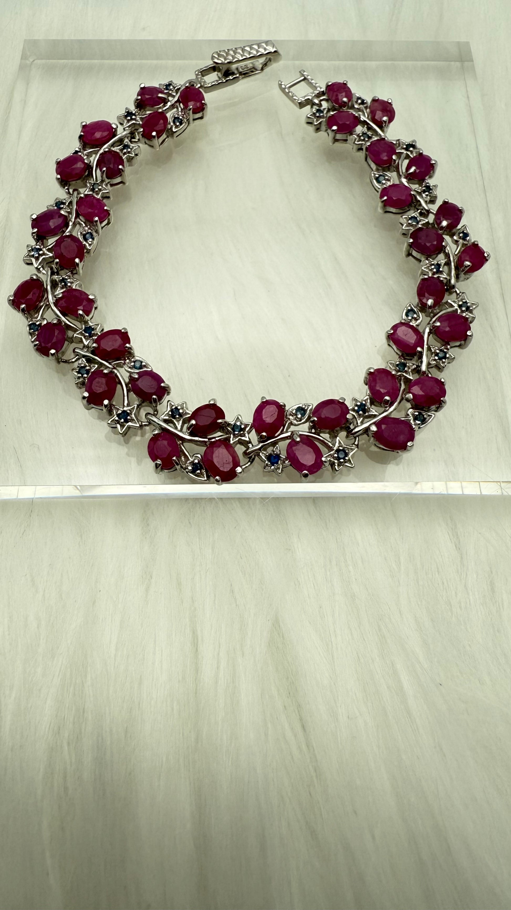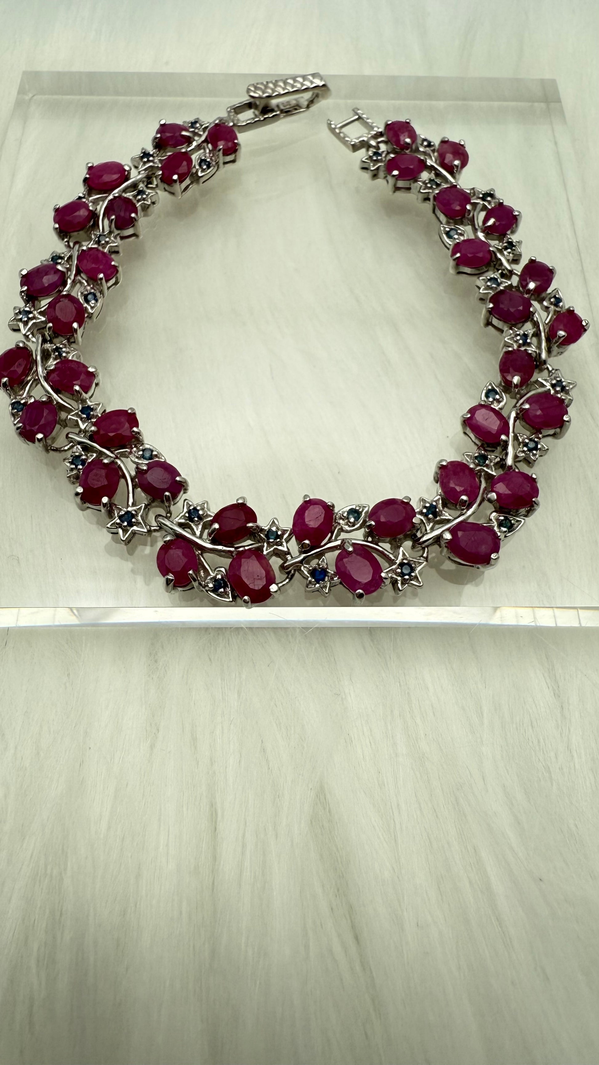 This natural ruby bracelet with blue sapphire was made intricately in platinum plated 925 sterling silver.