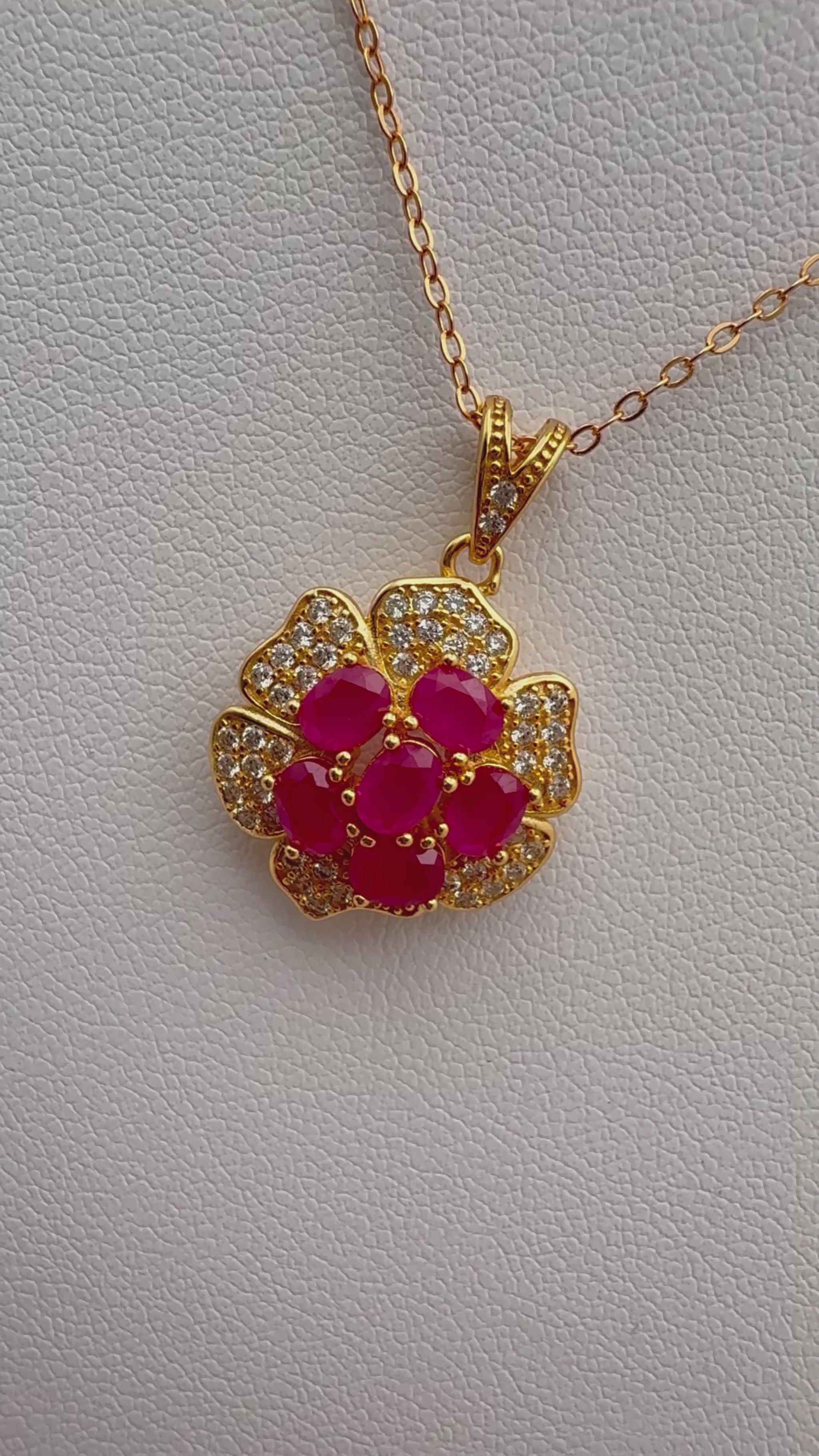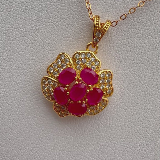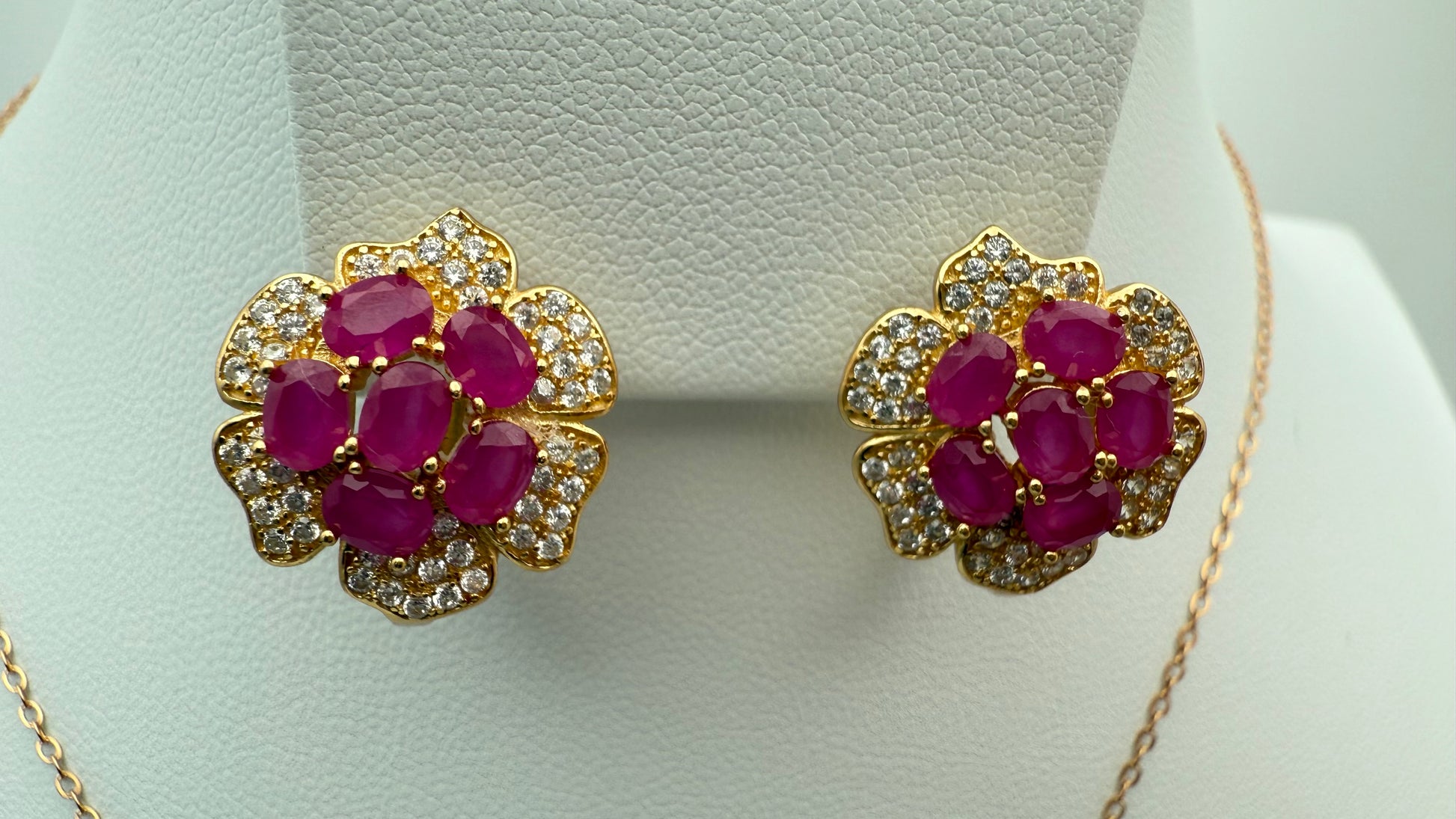 Floral design natural ruby gemstone full set yellow gold plated in 925 sterling silver with white cubic zirconia as accent.